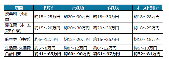 ■ ドバイ留学と欧米留学の費用比較(目安)